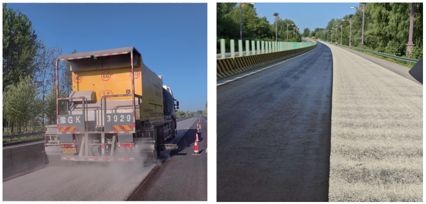 3、同步施工:专用封层车同步喷酒沥青+纤维,随即撒布碎石(粒径3~8mm); 碎石覆盖率≥80%(避免重叠或漏撒)。